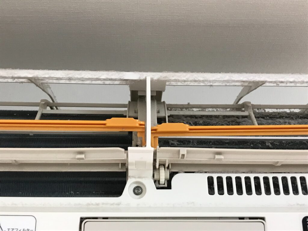 機械(ブラシなど)がフィルターの上を動くことで、ホコリをフィルターで裏ごしします。結果、エアコン内部にホコリが入り込んで大変な状態になっています💦