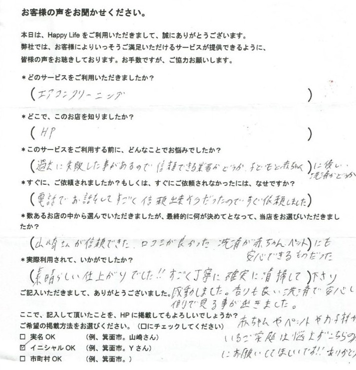 大阪府箕面市エアコンクリーニング 赤ちゃん子どもペットと暮らすお客様の声